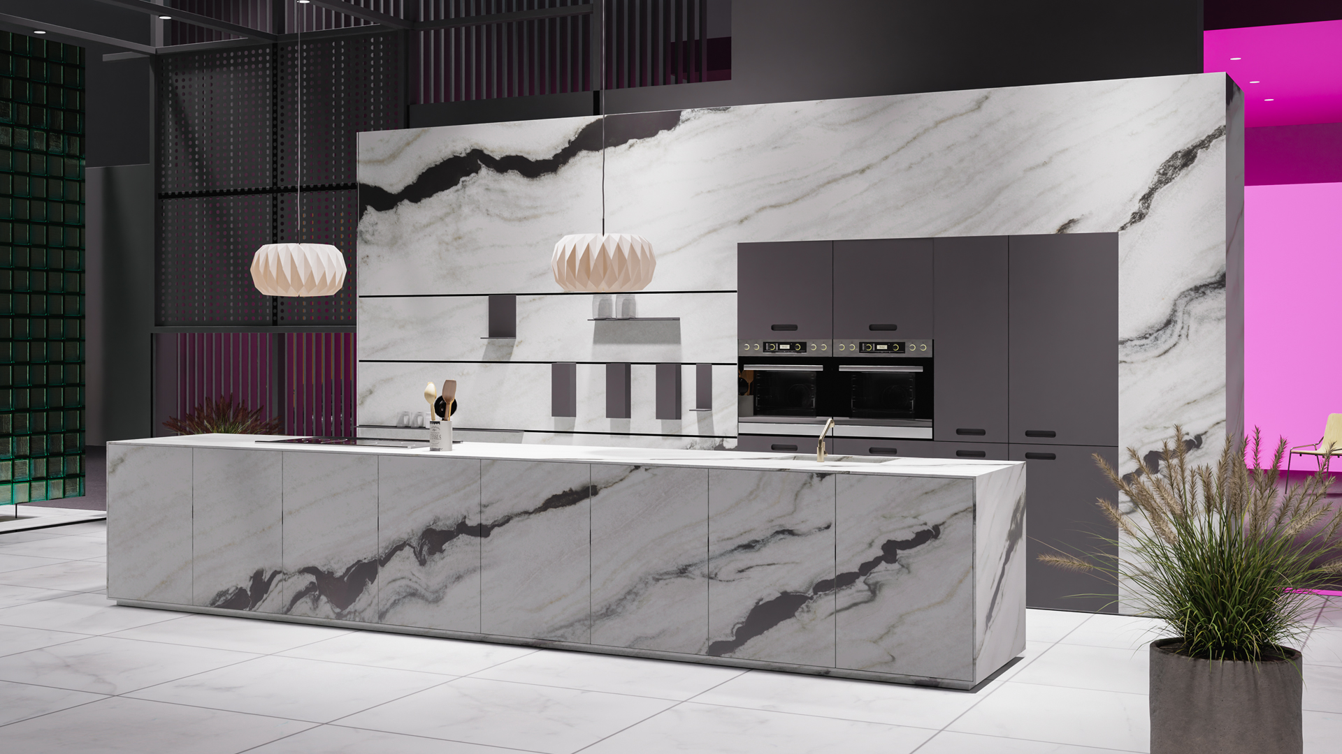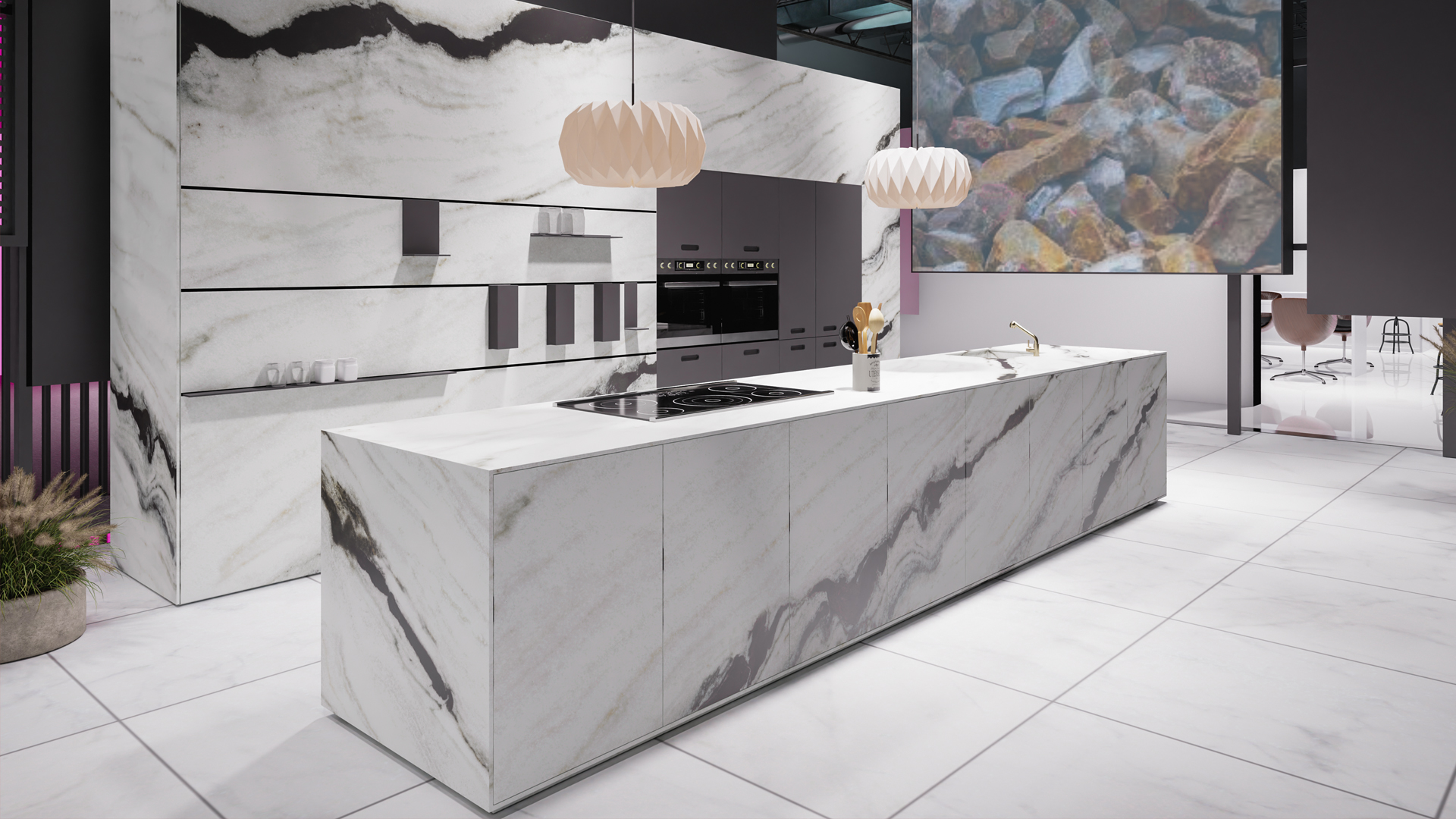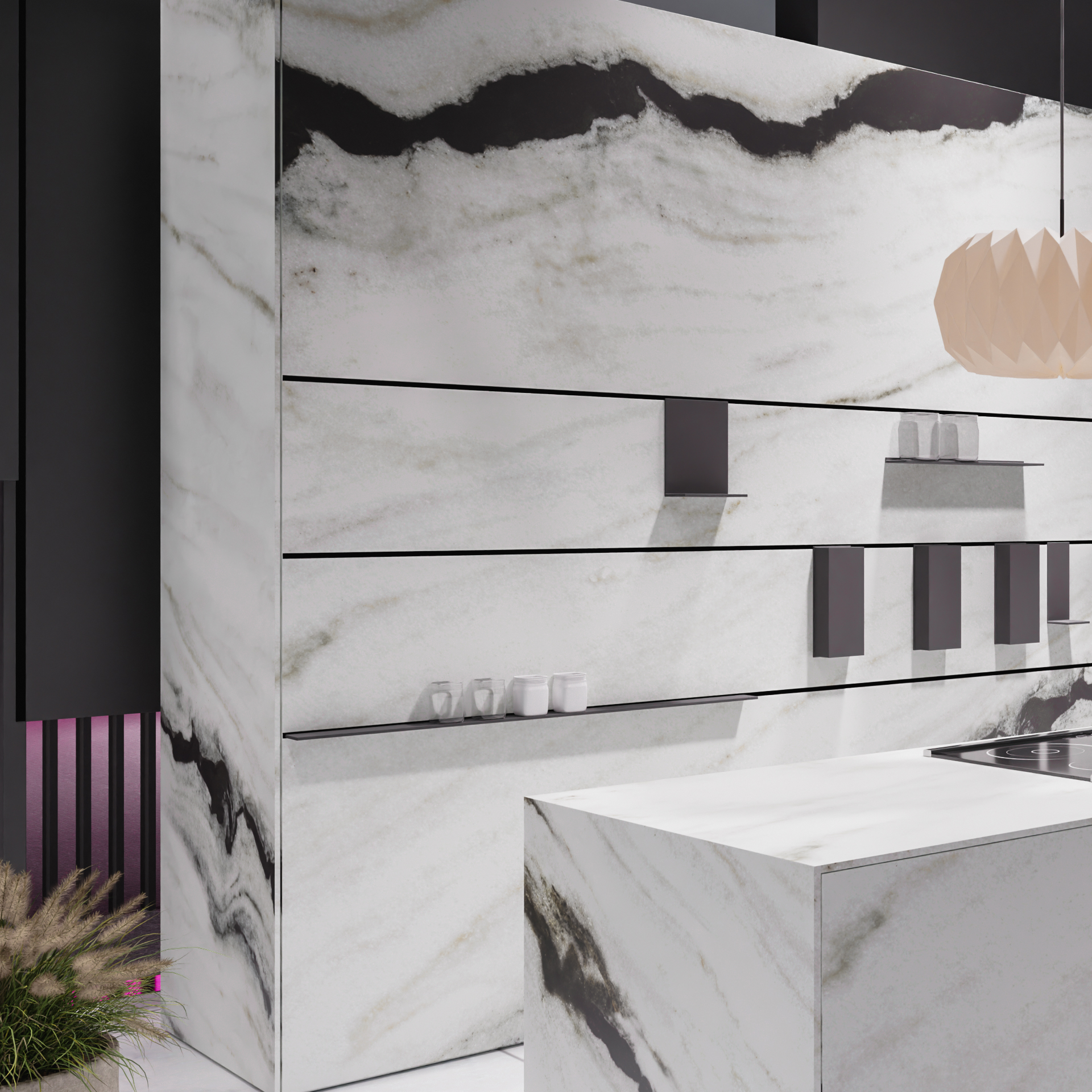 Panda White porselen yüzey, siyahın güçlü kontrastı ve beyazın zarafetiyle