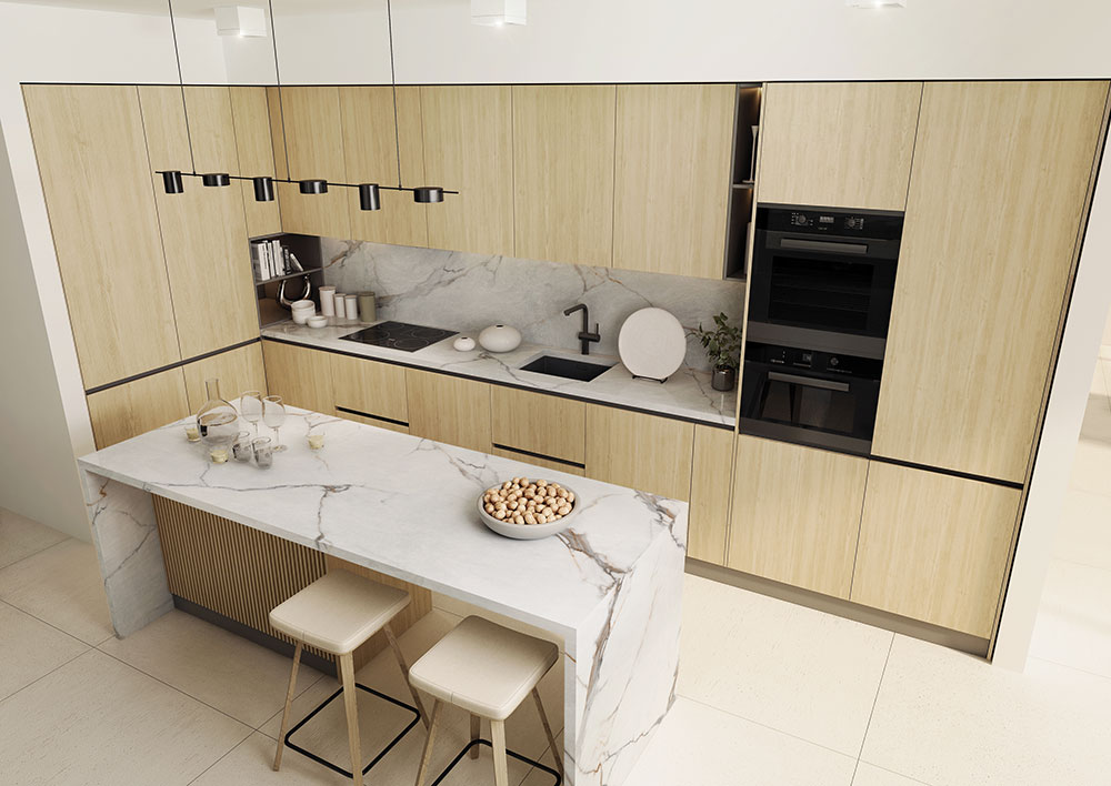 Mutfak ve banyo tezgahları, ada üniteleri ve iç cephe duvar panellerinde şık bir görünüm yaratmak için ideal bir seçimdir.