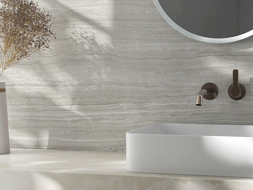 - Doğal Traverten Etkisi: Yatay doku yapısı ile doğal taş estetiğini çağdaş mekânlara taşır.